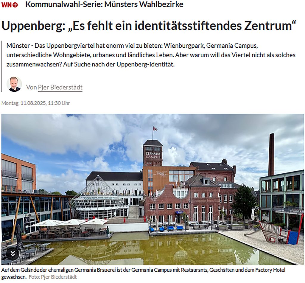 Um wieder Schwung aufzunehmen, lädt die Bürgerinitiative L(i)ebenswertes Uppenberg am Donnerstag dem 18. September 2025, um 18 Uhr interessierte Uppenberger:innen zu einem Meinungsaustausch in das Trockendock (Ecke Jahnstraße / Grevener Straße 152) ein. Beim auf zwei Stunden angelegten Meinungsaustausch steht insbesondere der Wechsel in eine verbindlicher Organisationsform, einen Verein, im Zentrum. Zudem soll über Spaziergänge in Uppenberg, wieder eine eigene Webseite und vielleicht auch Zeitung (Uppenberger Nachrichten) für das Viertel, die Situation in der Nahversorgung und eine Themen, Fakten, Bilder und Artifakten für ein geplantes Buch über Uppenberg gesammelt werden. Werner Szybalski wird als Einführung etwas zum aktuellen Ergebnis der Kommunalwahl vom 14. September 2025 im Stimmbezirk 5 sowie zu den früheren Kommunalwahlergebnissen in Uppenberg sagen. Jede:r ist herzlich willkommen.